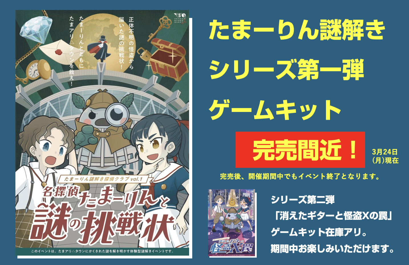 なお、同時開催中のシリーズ第二弾「消えたギターと怪盗Xの罠」は在庫が十分ありますので、そちらのイベントをお楽しみいただけますようお願いいたします。